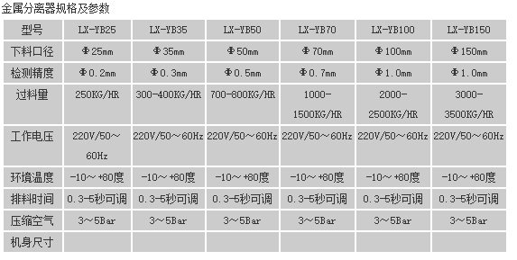 原料從料斗或送料器自由下落進入金屬分離器,如果沒有金屬雜質,原料會直接通過金屬分離器流向下端的出料口。如果檢測器檢測到原料中含有金屬,那么控制器立刻啟動分離板將金屬物和部分原料一起導向側面的排料口,然后分流板迅速恢復至正常的位置,分流板速度可調,金屬分離器的檢測精度也可根據生產需要調節,最小可檢測并分離出Φ 0.2mm的金屬顆粒。